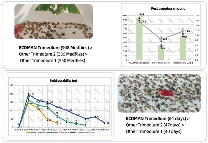 ECOMAN Trimedlure is designed based on the behavior of C. capitata towards specific odors. With a slow-release polymer carrier, it continuously emits the odor attracting C. capitata to the trapping device with remarkable efficacy. It offers a potent trapping and killing effect while maintaining environmental friendliness with no pesticide residues, Cost-effective and sustainable, ECOMAN Trimedlure is widely used in modern agricultural practices.